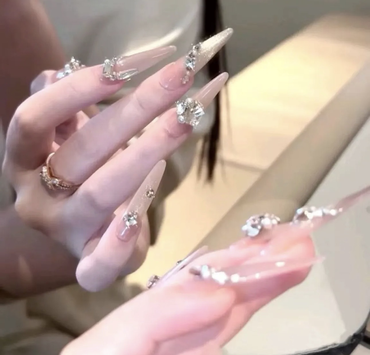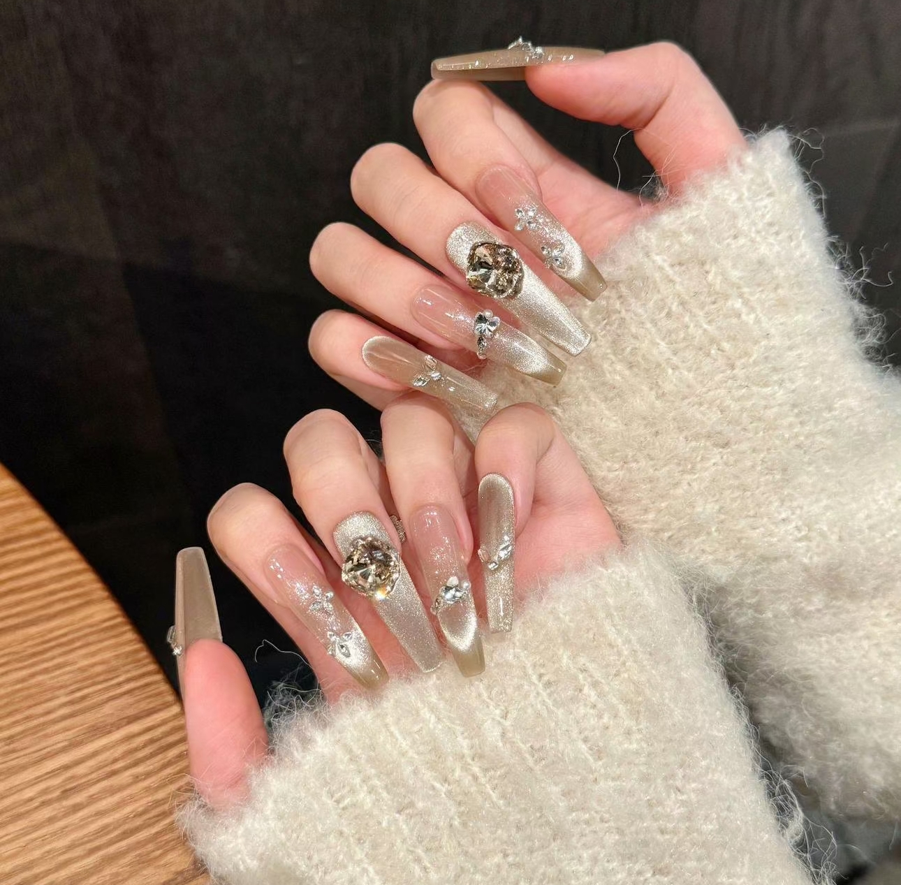 女神美甲穿戴甲爆闪猫眼法式香槟线条碎钻美甲辣妹显白可拆卸假指甲1副
